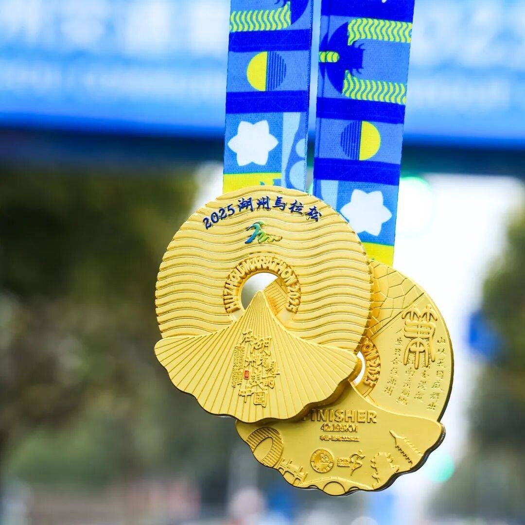 本届赛事完赛奖牌颜值与底蕴兼具,以湖州之韵为跑者留下“独家记忆”。正面以太湖碧波为幕,镶嵌一枚可转动的银杏叶,“在湖州看见美丽中国”的字样徐徐展现,寓意着湖州在生态文明理念指引下的华丽蜕变。翻转奖牌,丝、瓷、笔、茶渐次呈现,静静铺陈湖州的千年风雅。