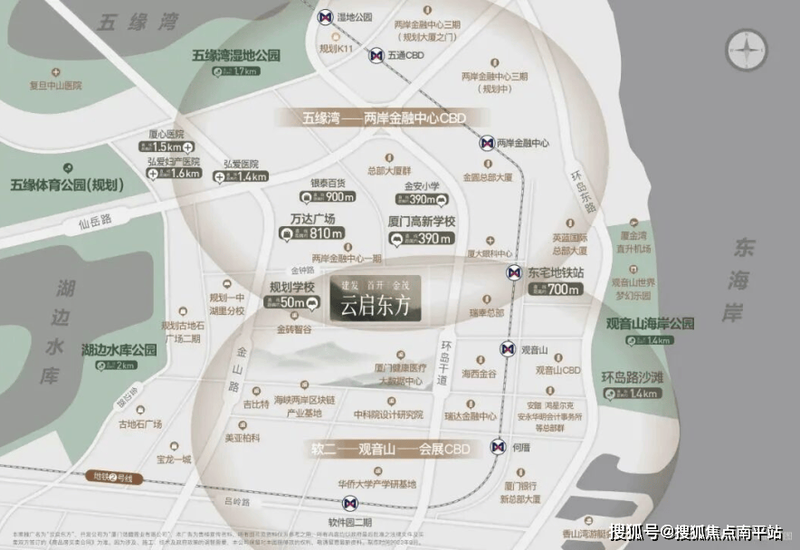 东侧北侧的五通高端商务区,聚集总部经济、新兴金融,目前已有通用金砖创新基地总部、英蓝集团区域总部、中乔体育总部、厦门航空总部、国贸集团总部、金圆集团总部、厦门农商行总部、厦门银行总部、厦门国际银行总部等入驻,厦门国际艺术品交易中心、东方万佳国际酒店在建,五通金砖TOD综合体、东宅TOD、柏明酒店等规划建设。